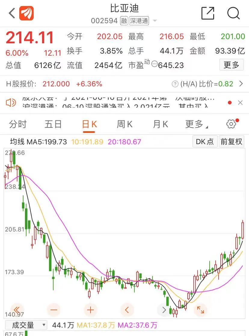 近期,比亚迪股价表现强劲,自5月7日创下阶段低点以来,截至目前已大涨近50%,报214.11元/股,市值超过6000亿。