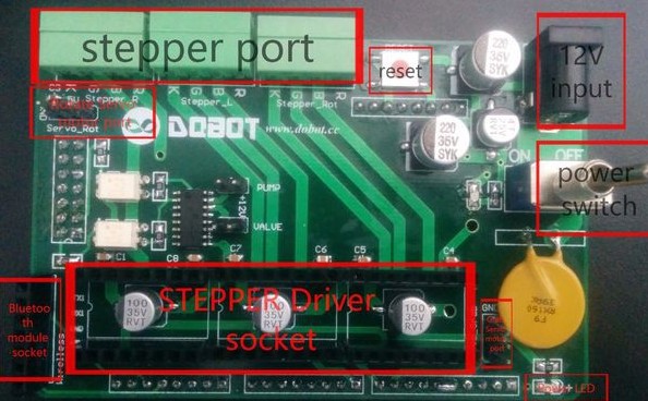 步骤13:连接电路 完成Dobot臂的机械部分后,我们应该连接Arduino控制部分的电路。 首先,将Dobot防护罩连接到Arduino MEGA2560,如图1所示。 其次,将电机驱动器插入相应的接口,如上图所示。插入后,您将获得下图所示的内容。注意旋钮的方向,请勿反向插入,否则在通电后会燃烧。 第三,插入步进电机端子。“ Steppter_R”端子用于大臂驱动电机,“ Stepper_L”连接到小臂驱动电机,“ Stepper_Rot”用于连接底盘的电机的旋转。板上丝印“ RBGK”是指分别与电动机“红色,蓝色,绿色,黑色”连接。请勿切换四线的位置,因为它们已在出厂时预设。 第四,将12V电源适配器插入图1(c)所示的插座,请注意,您需要将电源线连接到上述屏蔽端子,而不是Arduino MEGA2560端子。