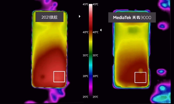 联发科还放出了红外温度图,可以对比下天玑9000与2021安卓旗舰处理器的表现,红色代表的高温区域要小不少。