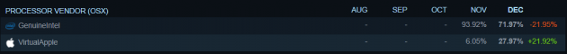 而在 macOS 系统中,英特尔则是另一番景象。英特尔 12 月份额暴跌 21.95%,占比为 71.97%;苹果 M 系列处理器则猛增 21.92%,份额增长至 27.97%。