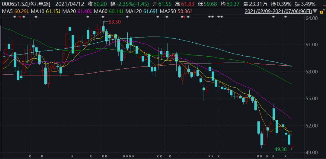 然而格力市值并没有就此稳住,6月28日开盘至7月5日收盘,其股价进一步从53.9元下跌到49.89元。