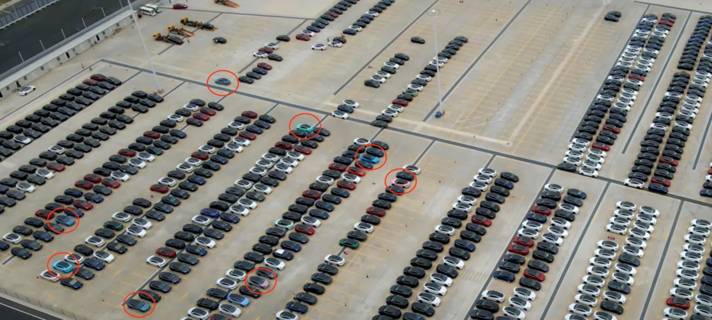 从下图可以看出,上海超级工厂有不同的颜色组合,如粉色、浅绿色、浅蓝色等。这可能表示将交付定制汽车。