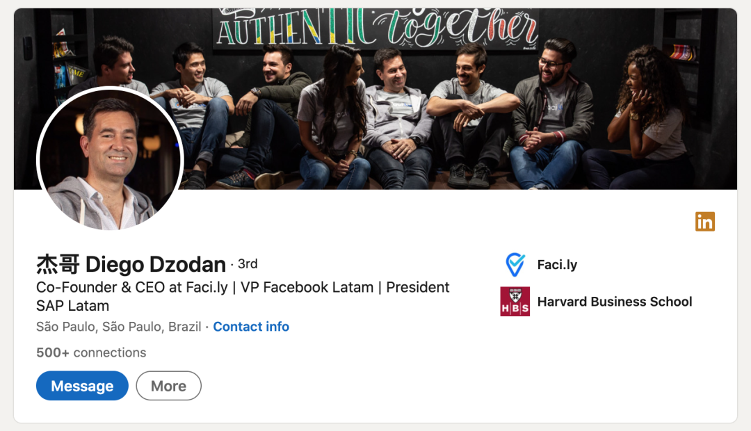 迭戈佐丹在谈到Facily的时候,特别不介意提到拼多多,甚至明确表示,就是研究了拼多多之后才辞职创业。不知道这和中国社交电商“师承”的这段经历有没有关系,迭戈还在自己的LinkedIn上挂了一个特别接地气的中文名:“姐哥”。