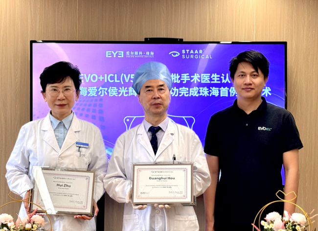 EVO+ICL(V5) 晶体品牌方STAAR公司代表表示,此例手术为珠海区域首例相关手术,珠海爱尔眼科医院侯光辉院长与 珠海爱尔眼科医院屈光手术专科朱卉主任 也同时获授区域首批EVO+ICL(V5)手术医生认证,该认证基于医生在ICL手术领域的临床经验与技术水准,进一步体现医院在屈光手术方面的专业积累。
